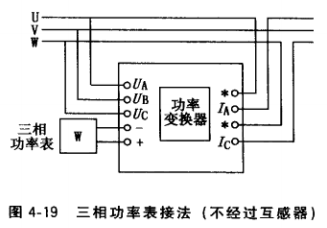 (3)接入三相功率表的三相電壓和電流均經(jīng)互感器,再接至功率變換器.如圖4-21所 示。這種接法只要配上不同變比的電壓、電流互感器,可測(cè)任何電壓、電流下的功率。